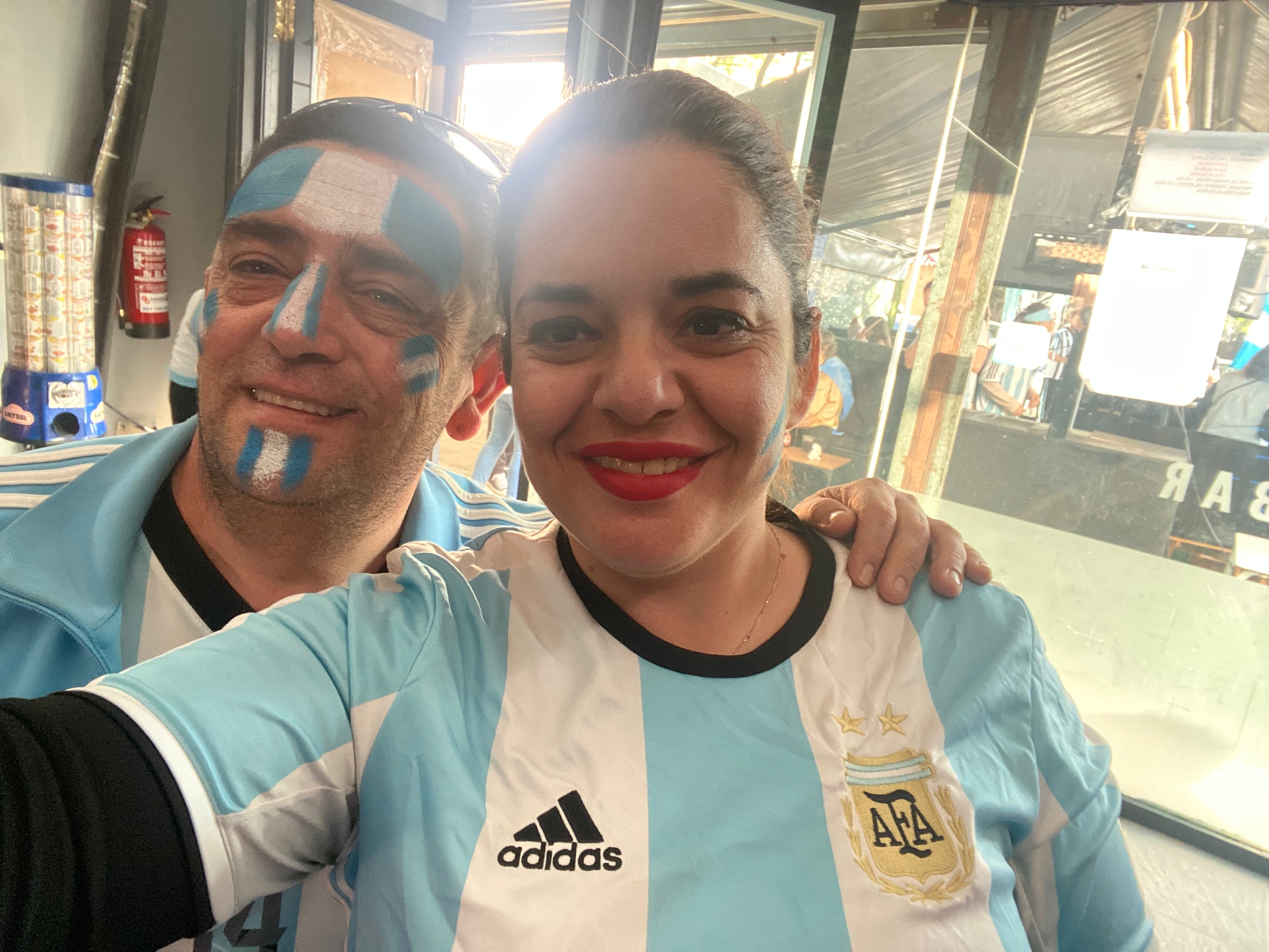 Desde la mañana de este domingo temprano, cuatro sanjuaninos que viven en España se unieron a otros argentinos para alentar a la Selección Argentina en la previa de la final del Mundial Qatar 2022.