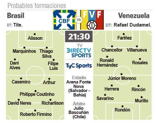 El seleccionado brasileño, anfitrión de la Copa América y máximo candidato al título, enfrentará hoy a Venezuela por la segunda fecha del Grupo A después de su debut con goleada ante Bolivia en la apertura del torneo. El partido se jugará en el estadio Arena Fonte Nova de Salvador de Bahía desde las 21.30, con arbitraje del chileno Julio Bascuñan y transmisión de los canales TyC Sports y Directv Sports.
