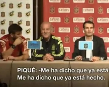 Piqué: "Hay que defender un poco a Cesc. Me ha dicho que ya está hecho. Se va ya, 33 millones me ha dicho".Del Bosque: "No va a ganar para disgustos el presidente (del Barcelona, Josep Maria Bartomeu), me cago en la leche. Lo vais a volver loco al pobrecillo".