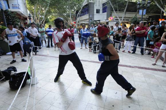 Es que esta tarde, el Club Mocoroa se instaló en pleno centro para promocionar la temporada de boxeo que se viene y en ese marco, montó un mini ring en el que varios pupilos demostraron sus habilidades ante un centenar de espectadores que paseaban por la peatonal.