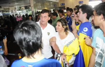 El primero en asomarse en la sala de arribo fue el técnico Falcioni, quien levantó su mano y saludó a los fanáticos que esperaban para sacarse fotos con sus ídolos. Detrás apareció todo su cuerpo técnico y minutos después los jugadores entraron en escena.