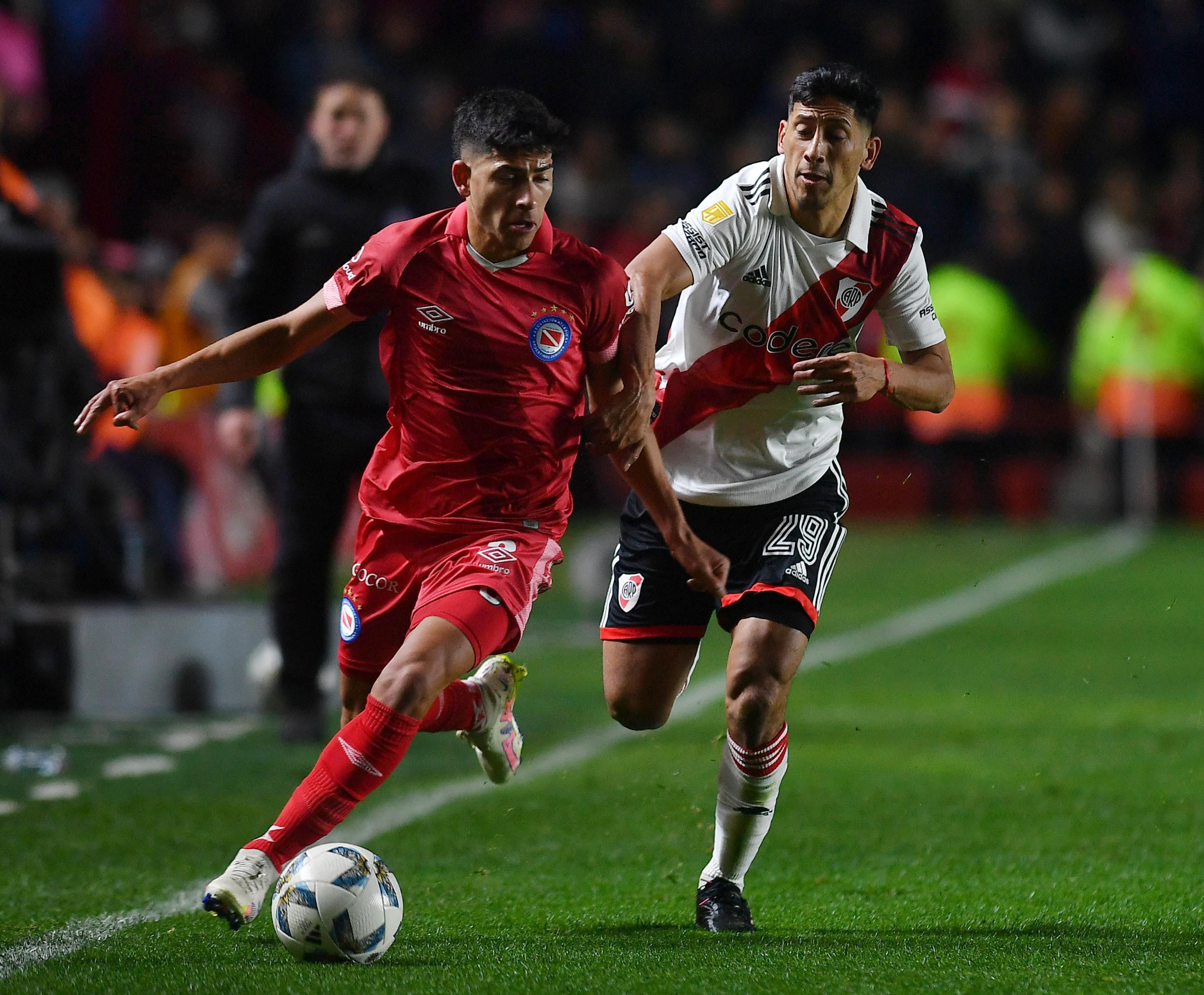 Los antecedentes daban como para esperar que el partido fuera lo que fue un choque muy atrapante. Así, tras un tiro de esquina le permitió al defensor Marco Di Césare, de cabeza, convertir su primer gol en el profesionalismo. River tardó un par de minutos en reaccionar, hasta que empezó a hacerlo mediante Esequiel Barco. Y la igualdad llegaría entonces desde el aire tras dos cabezazos en el área: la empezó dando Miguel Borja, al bajar un centro para que Agustín Palavecino completara la obra con el balón en la red de Argentinos a través de una "palomita".