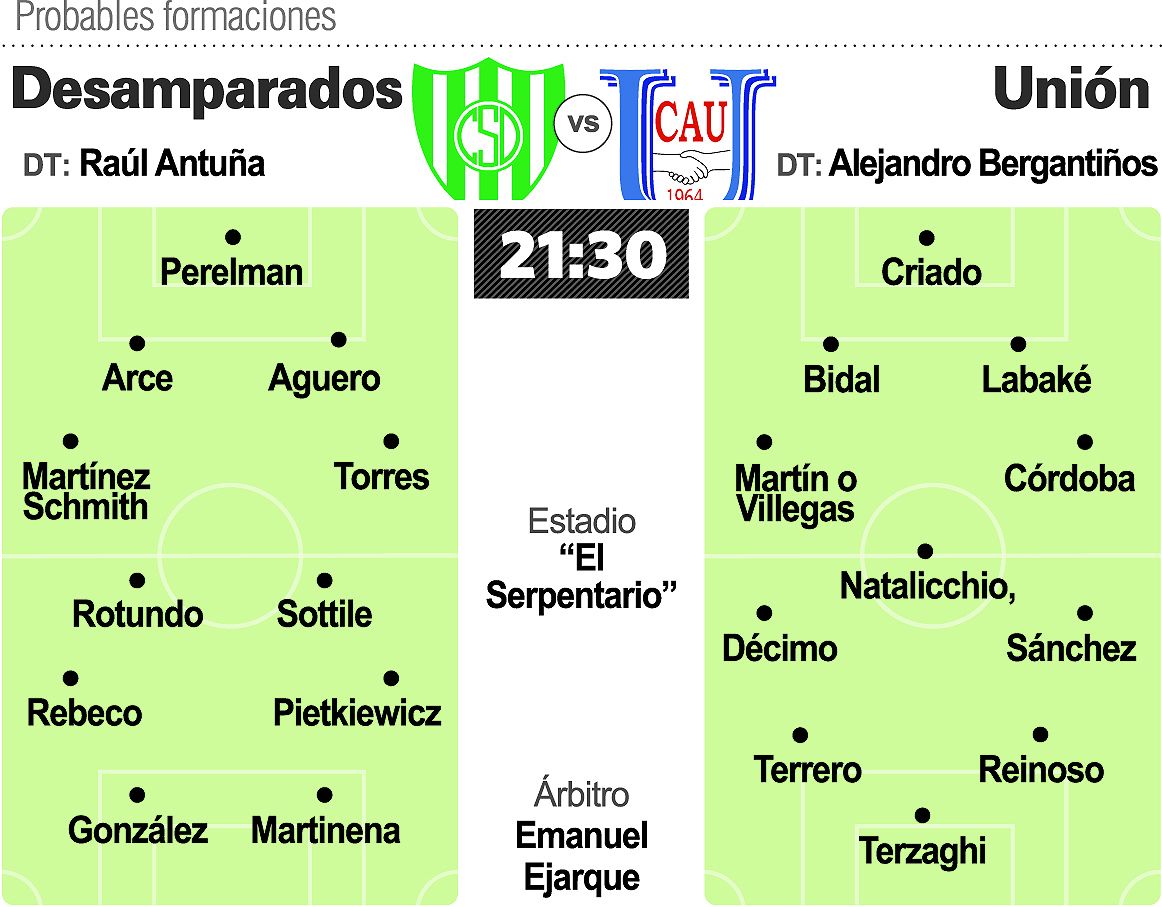 Sportivo sabe que es el momento justo para dar el batacazo y romper con el karma que arrastra hace casi cuatro años. El último triunfo ante Unión fue el 8 de noviembre del 2013 en el viejo Argentino B (2-0). Después, en los cinco cruces restantes entre sí, hubo una sola victoria de Unión al inicio del Federal "A" anterior y cuatro empates. Desamparados viene entonado tras ganar de visitante y buscará con el triunfo alcanzar la cima por lo menos hasta mañana cuando se complete la fecha. Presentará una sola variante y será el ingreso del volante Mario Rebeco por Nahuel Olivari.
