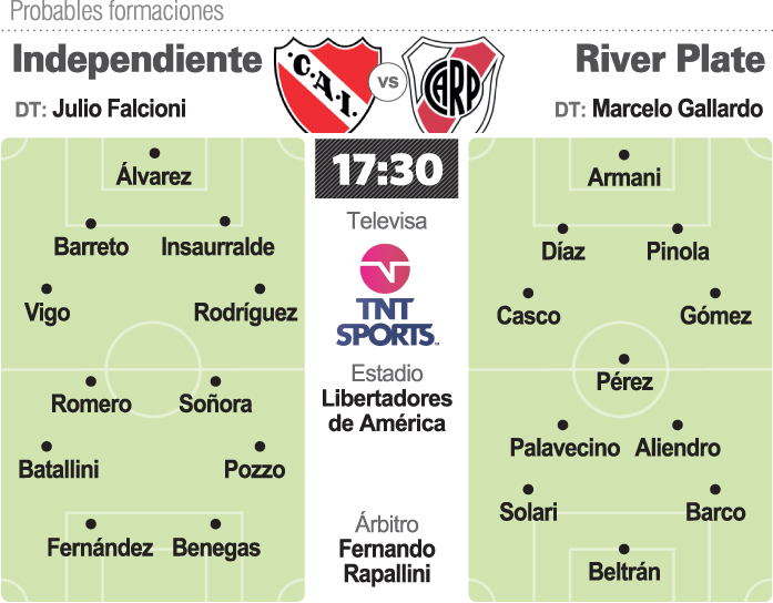River Plate, sumido en una etapa de irregularidad y con la urgencia de acercarse a la punta, visitará hoy a Independiente, ilusionado con el regreso del entrenador Julio Falcioni y que aguarda con ansias las elecciones de octubre próximo, en el clásico de la 12da. fecha de la Liga Profesional de fútbol (LPF), que se jugará desde las 17.30, y será arbitrado por Fernando Rapallini y televisado por TNT Sports.