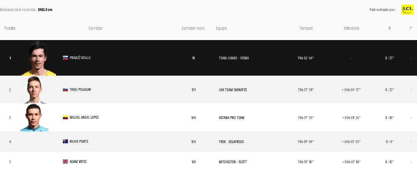 A 3’05" y cuarto en la general marcha el australiano Richie Porte, que cerró la etapa en el quinto lugar a 1’01" del vencedor y a espaldas del estadounidense Sepp Kuss, cuarto en el tramo a 56 segundos de López.
