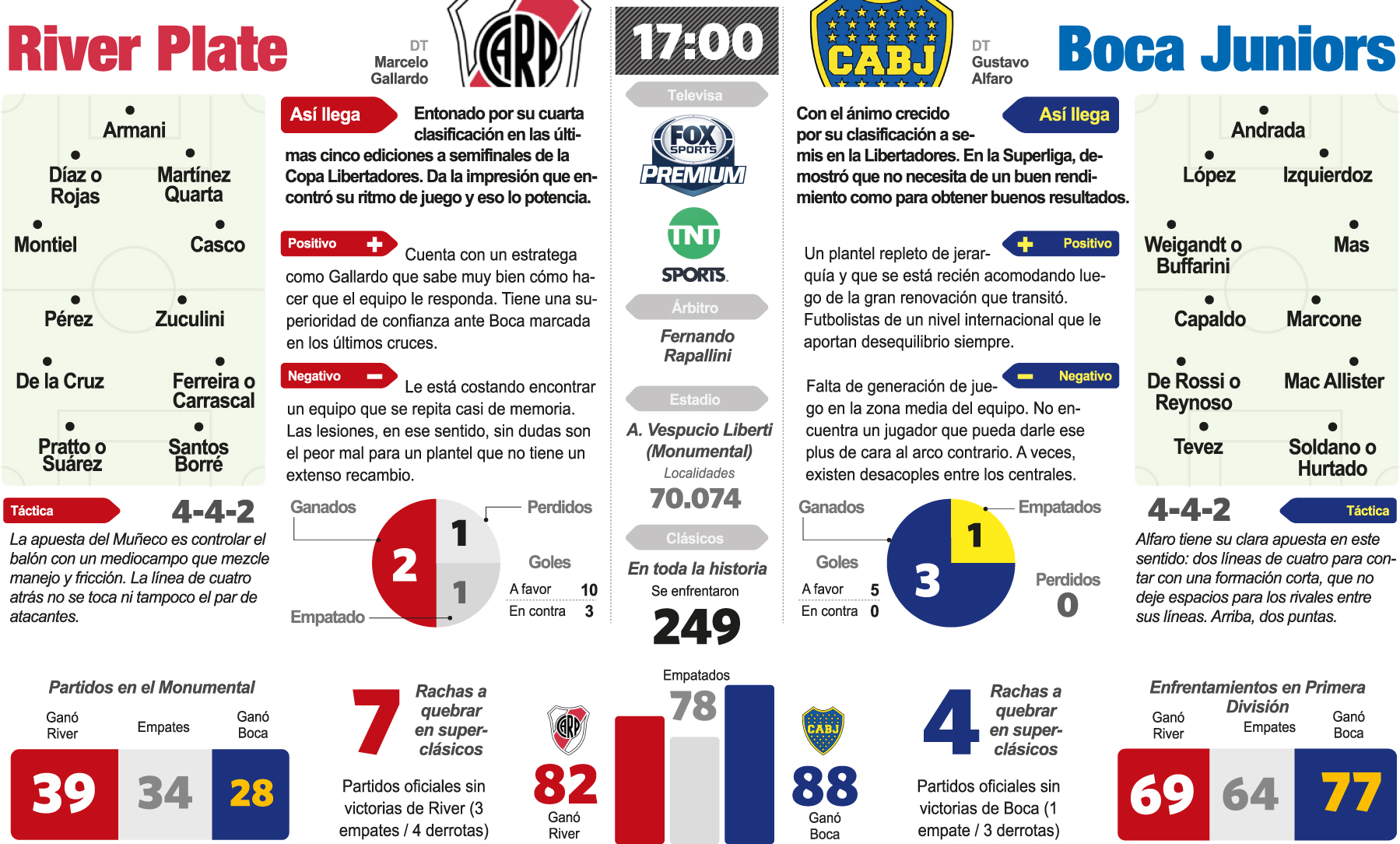 River y Boca jugarán hoy un superclásico de especial significancia por tratarse del primero desde la disputa de la memorable final de la Copa Libertadores 2018 en el estadio Santiago Bernabéu de Madrid, que marcó una bisagra en la apasionante historia del enfrentamiento entre los clubes más importantes de Argentina.