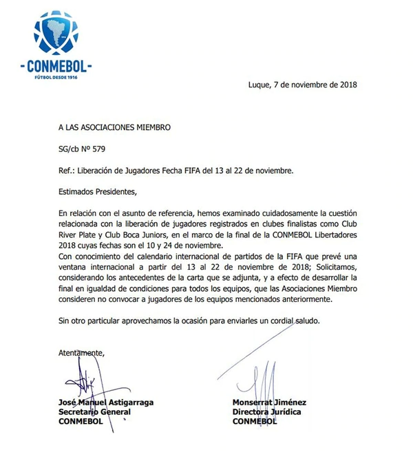 Por ese motivo, la Conmebol publicó un comunicado en el que le solicita a los combinados nacionales no incluir en sus listados para los próximos amistosos a los jugadores de Boca y River. De esta manera, los futbolistas llegarían descansados y ambas escuadras en igualdad de condiciones.
