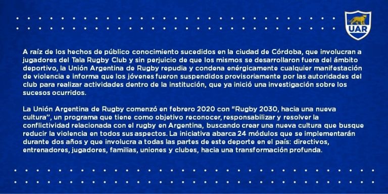 La Unión Argentina de Rugby (UAR) elevó un comunicado de repudio tras los hechos de violencia registrados por jugadores del club cordobés Tala Rugby Club, condenándolos "aún cuando se hayan producido fuera del ámbito deportivo".