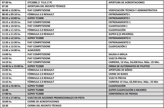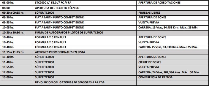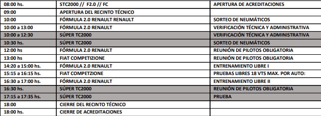 La actividad oficial para el Súper TC2000 comenzará el viernes con una tanda libre de 20 minutos que, seguramente, servirá para que los equipos continúen evolucionando sus autos y, a su vez, los pilotos conozcan el circuito.