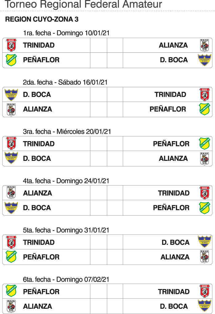 Se viene el 2021 y para el cuarteto sanjuanino que comenzó a jugar hace casi un año el Torneo Regional Federal Amateur será el momento del reestreno. Alianza, Trinidad, Defensores de Boca y Atlético Peñaflor ya miran el comienzo del fin de semana del 9 y 10 de enero, sabiendo que será al todo o nada y sin margen de error. Después de toda la incertidumbre que se generó primero con la suspensión del certamen en marzo cuando se declaró la pandemia y luego, más acá ya en noviembre, cuando desde el Consejo Federal de AFA no había fecha para el reinicio, finalmente los cuatro equipos de San Juan que están en la Segunda Fase del Torneo Regional Federal Amateur ya tienen calendario apuntando al 10 de enero como día de inicio para la Zona 3 de la Región Cuyo. En esta etapa, los cuatro sanjuaninos jugarán entre sí, todos contra todos y clasificación al primero. Será intenso el calendario, con seis partidos, en menos de un mes porque el 7 de febrero ya terminará.