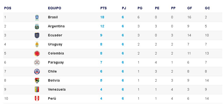 Posiciones de las Eliminatorias Sudamericanas rumbo a Qatar 2022