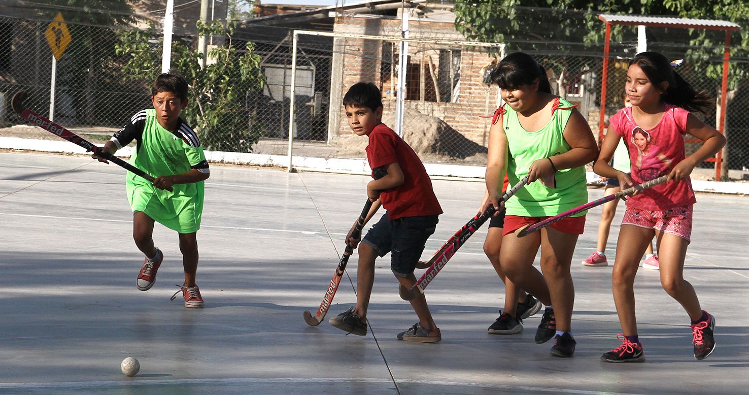 Acción. Las chicas juegan al hockey en un playón de la Unión Vecinal del barrio. El deporte, una vez más, ayuda a que los chicos se sientan valorados.