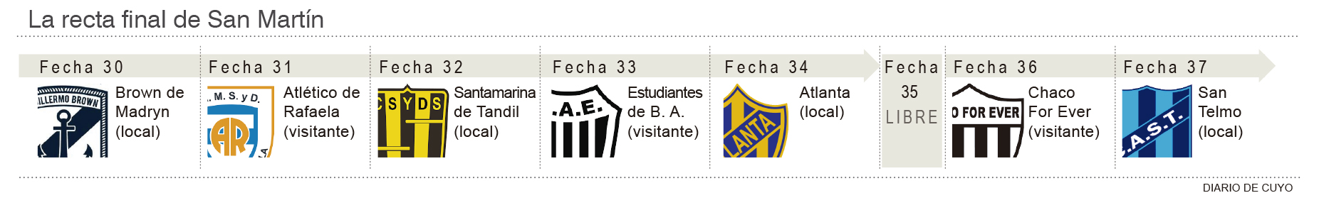 En la fecha 32, el que llegará es Santamarina de Tandil que pelea por la permanencia en una situación más que compleja siendo hoy el último de las posiciones. En la fecha 34, el que jugará en Concepción será Atlanta que hoy está en posición 28 a 14 puntos de San Martín pero a sólo 6 de la zona de descenso. En la fecha 37, la última, ya con la jornada libre cumplida el rival de San Martín será San Telmo que está en el lote de abajo, con escasas chances de meterse en el Reducido pero con el peligro implícito de caer en zona de descenso. En síntesis, en los cuatro que le quedan en San Juan, para el Verdinegro sólo uno de ellos está en su misma línea de ambiciones y los otros tres, en la peligrosa pelea por la permanencia.