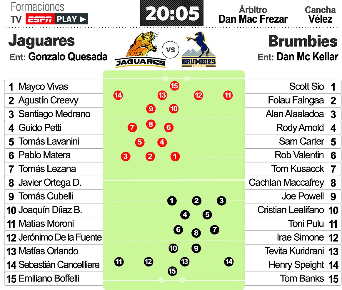 Los australianos vienen en una racha positiva que incluyó la goleada 38-13 sobre los Sharks de Durban (Sudáfrica) en cuartos de final. La última derrota de Brumbies fue justamente en Buenos Aires ante los Jaguares, a quienes vencieron en los dos partidos anteriores: 25-20 en Canberra en 2018 y 39-15 en Vélez en 2017.