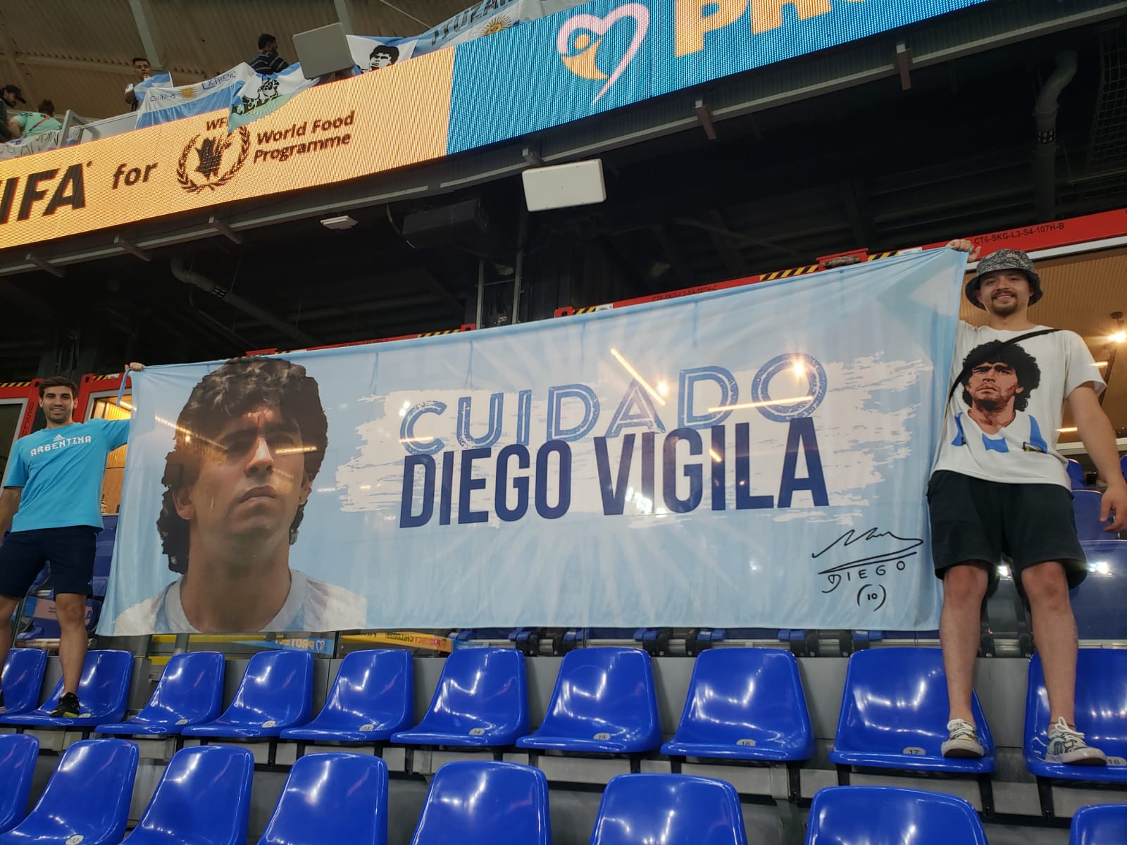 "Si bien somos muchos argentinos, el 40% son de la India y Bangladesh, es increíble el fanatismo por Argentina", agrega Ramiro Salvá. Los sanjuaninos llevaron una bandera con la imagen de Diego Maradona y la leyenda: "Cuidado, Diego vigila". El sanjuanino cuenta que es increíble el fervor que despierta una imagen de Maradona en Qatar: "Previo al partido contra Polonia colgamos la bandera afuera de la cancha y la gente hacía cola para sacarse fotos, le daban besos, le hacían reverencias. Gente de todas las edades, pibes, mujeres grandes, hombres y de distintas nacionaliddes: yankees, polacos, indios. Es increíble. Se deben haber sacado mas de 200 fotos", comentó el sanjuanino que seguirán disfrutando al máximo del Mundial, con la ilusión más firme que nunca.