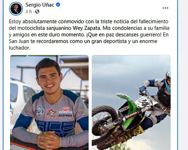 El gobernador Sergio Uñac y el secretario de Deportes, Jorge Chica, subieron a sus perfiles de Twitter mensajes de condolencia. Clubes de fútbol, como Boca Juniors y San Martín, también expresaron su dolor.