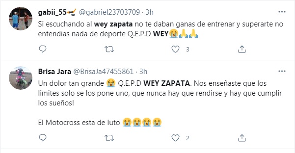 Y, recorriendo algunos tuits, hubo variados mensajes, de conocidos, amigos y gente en general que lamentó su pérdida. "CON VOS A TODOS SE NOS ACABARON LAS EXCUSAS Y LOS DOLORES (NdR: en las redes, el texto en mayúsculas significa que es un pensamiento expresado comos si fuera un grito). Todos aprendimos de vos y tu pasión", escribió
