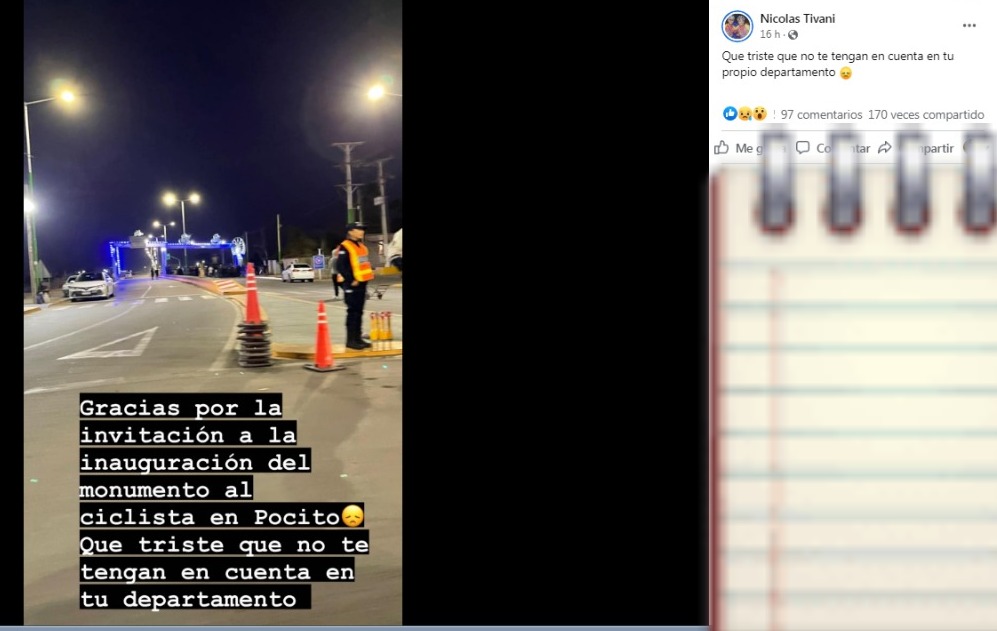 En la noche de este martes, en Pocito se inauguró el monumento al ciclista, que está emplazado en Calle 11 a metros de avenida Joaquín Uñac. A través de las redes sociales, el número 1 del ciclismo local y queridísimo en el ambiente pedal, Nicolás Tivani posteó una foto con la siguiente frase: "Qué triste que no te tengan en cuenta en tu propio departamento".