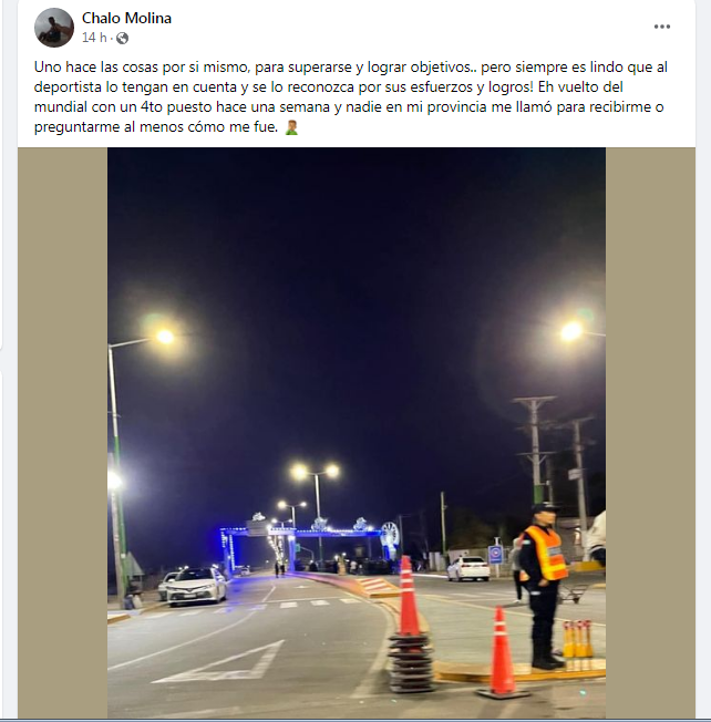En su muro, "Chalo", como todos le dicen con cariño, se sumó a las palabras de su colega de ruedas y agregó: "Uno hace las cosas por si mismo, para superarse y lograr objetivos… pero siempre es lindo que al deportista lo tengan en cuenta y se lo reconozca por sus esfuerzos y logros! He vuelto del mundial con un 4to puesto hace una semana y nadie en mi provincia me llamó para recibirme o preguntarme al menos cómo me fue".