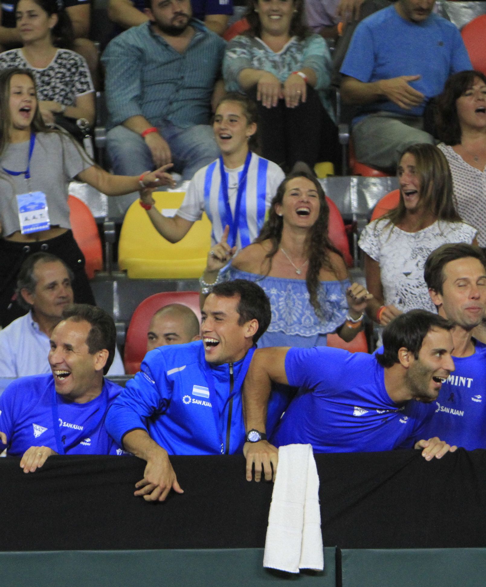 El equipo argentino, capitaneado por Daniel Orsanic, no dejó de alentar primero a Kicker y luego a Schwartzman. Sufrieron, disfrutaron y acompañaron para demostrar que funcionan como grupo, constantemente alentando a pocos metros del banco de los singlistas, detrás de los carteles.