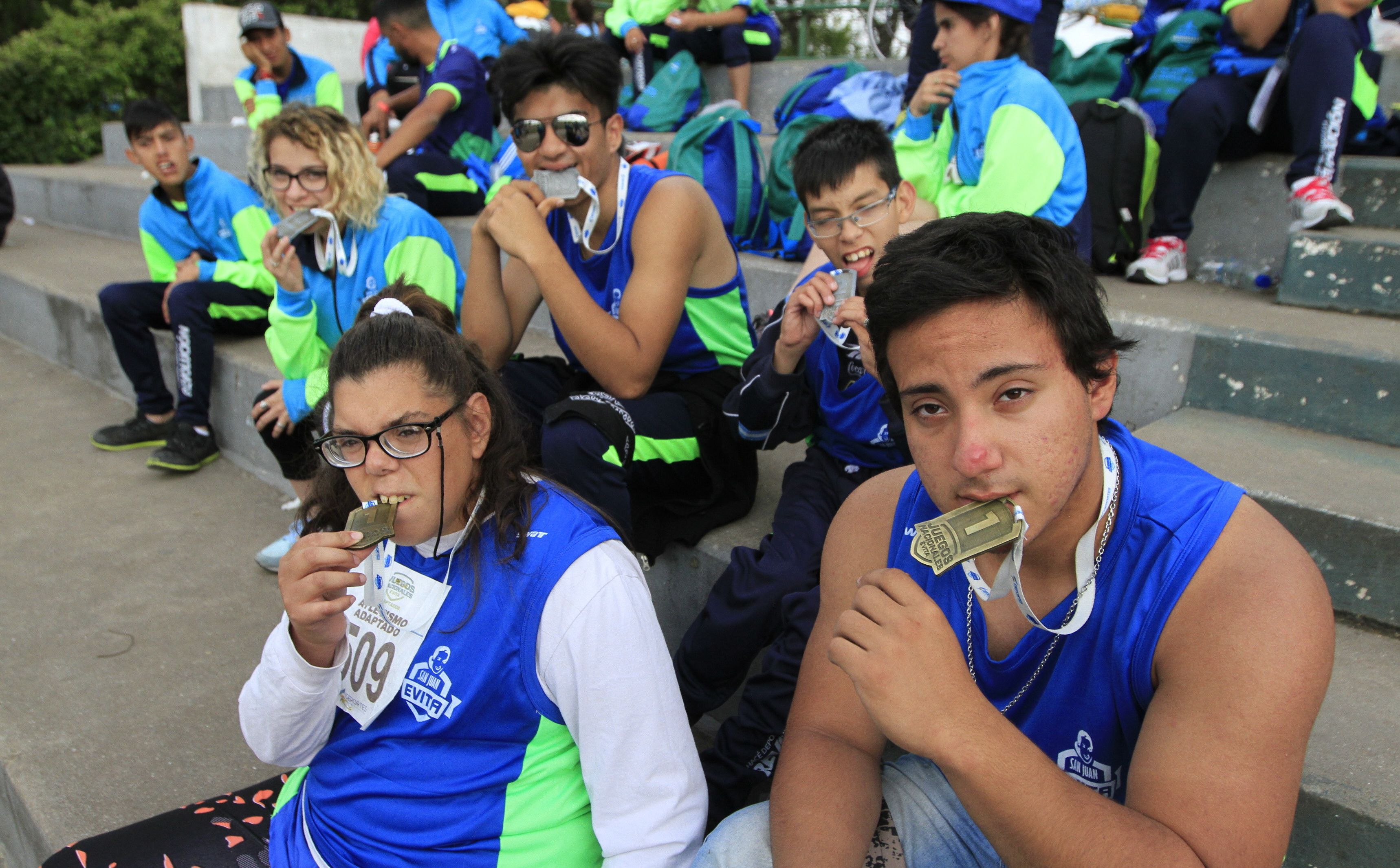 Los cinco medallistas del atletismo adaptado muestran sus medallas. Sofía Rojas y Milagros Castro ganaron medallas de oro (lanzamiento de bala y salto en largo). Plata, consiguieron: Estaban Vallejos y Mariano Tejada (en 80 metros, distintas edades) y Tiara Sambor (bala).
