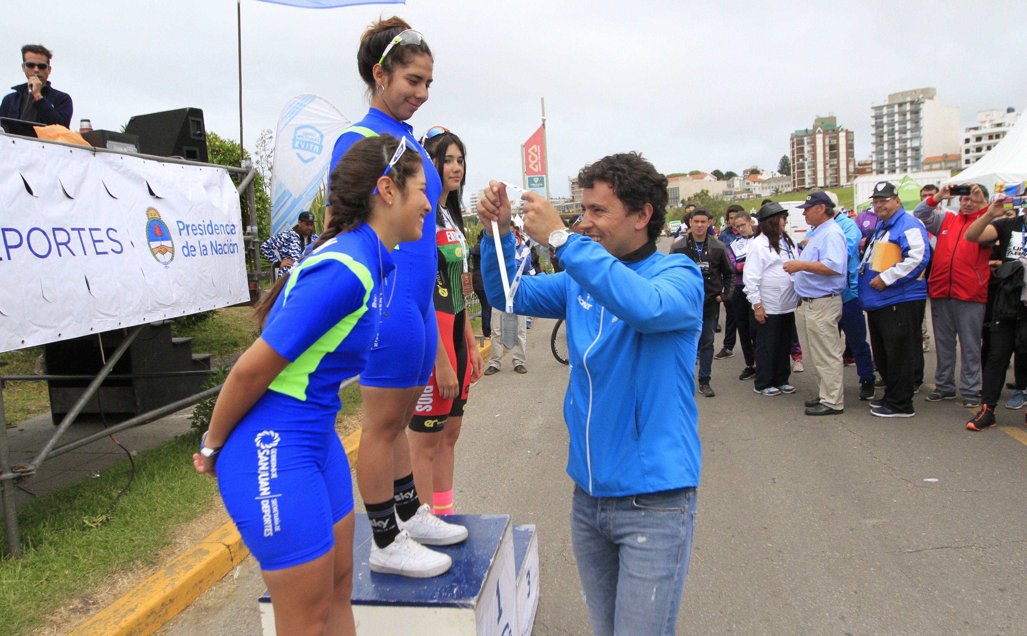 El secretario de Deportes de San Juan, Jorge Chica, coloca la medalla de plata a Guadalupe Godoy, luego hizo lo mismo colgando del cuello de Magalí Balmaceda la de oro. Ambas dominaron las vueltas a los puntos para damas. Magalí sumó así su tercera medalla dorada.