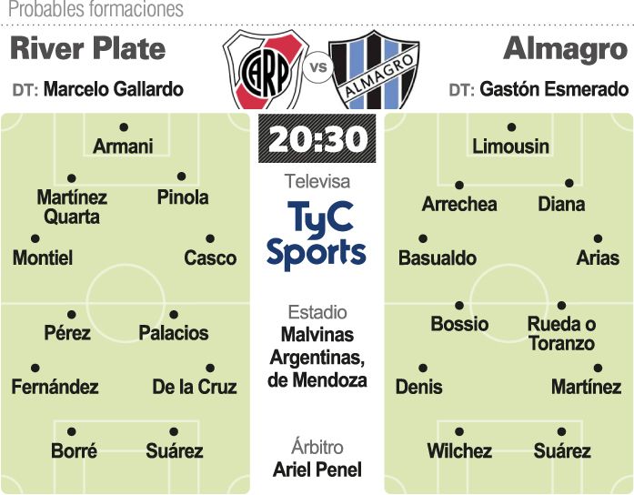 River Plate, mientras aguarda el desquite por la semifinal de la Copa Libertadores que lo enfrentará a Boca el 22 de octubre en la Ribera, jugará hoy ante Almagro, en un partido por los cuartos de final de la Copa Argentina. El encuentro se disputará desde las 20.30 en el estadio Malvinas Argentinas, en Mendoza, con el arbitraje de Ariel Penel y televisado por TyC Sports.
