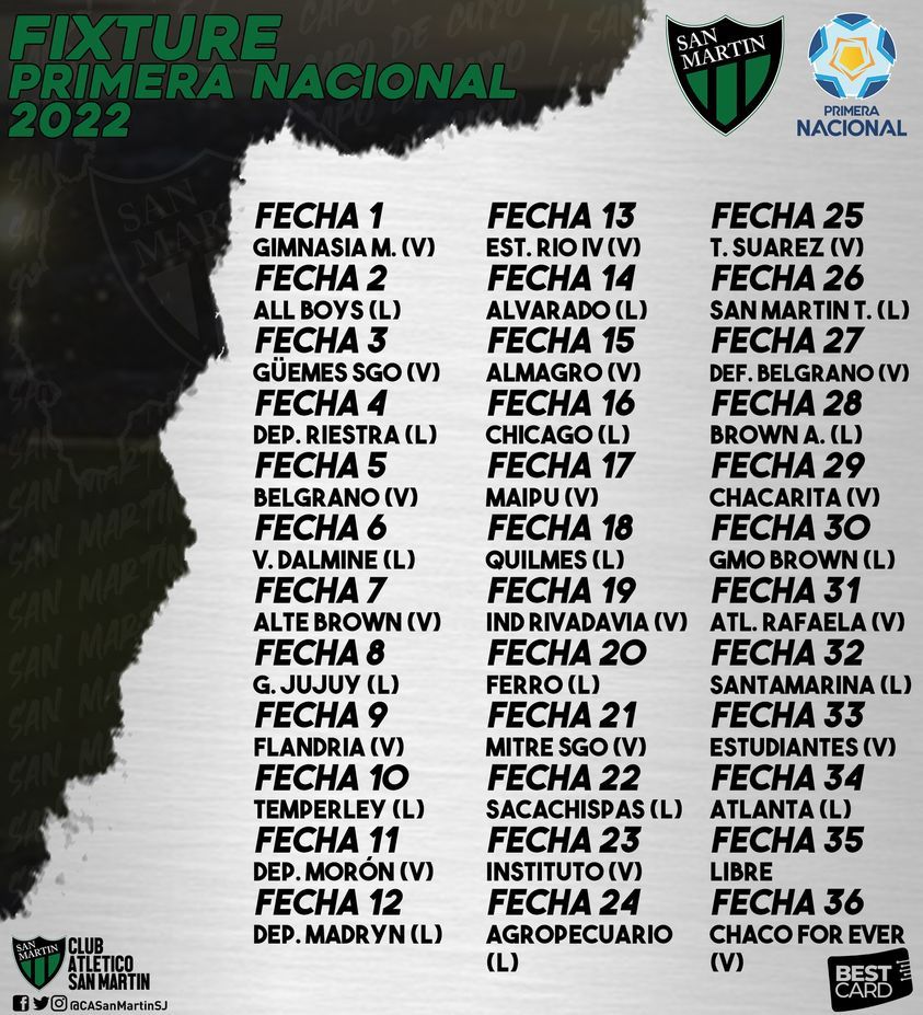 El fixture completo de San Martín en la Primera Nacional