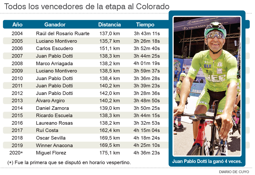 La mañana sabatina de la carrera de 2004, cuando la carrera la ganó por segunda vez Oscar Villalobo, se convirtió en la penúltima etapa. El chamicalense Raúl del Rosario Ruarte, junto al fallecido Roberto Bernard, uno de los dos más ganadores de clásicas en la historia del ciclismo sanjuanino; cuando se encontraba en el ocaso de su carrera se convirtió en el primero en coronar la máxima altura.