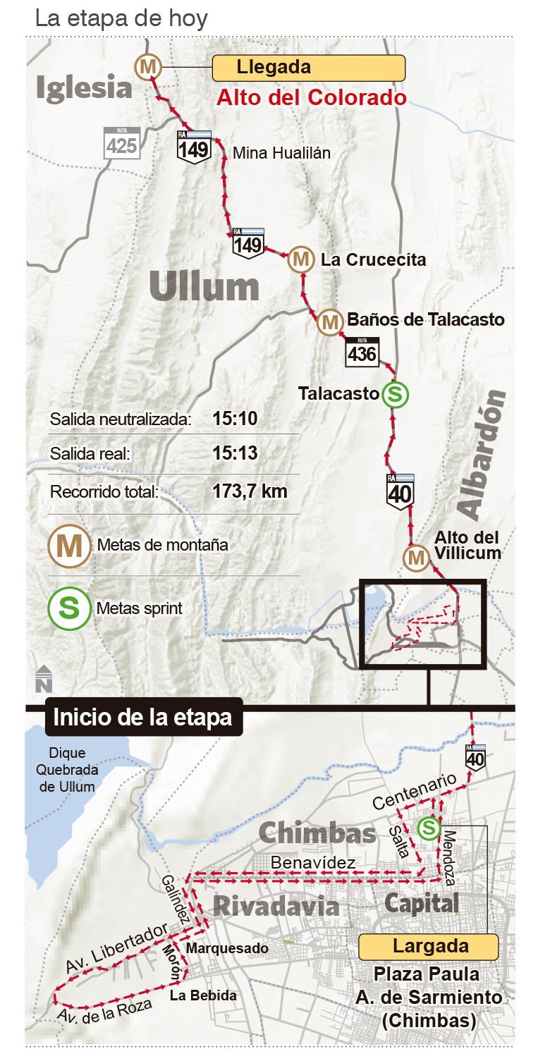 Sin Calingasta, a la que ahora se llega por otro camino, uno que en el inicio es el mismo que recorrerán esta tarde; surgió la opción de "llevar" la carrera al Alto del Colorado, que según la guía de la competencia, está ubicado a 2.624 metros sobre el nivel del mar, pero que en las registros cartográficos se indica que su cima está a 2.753.