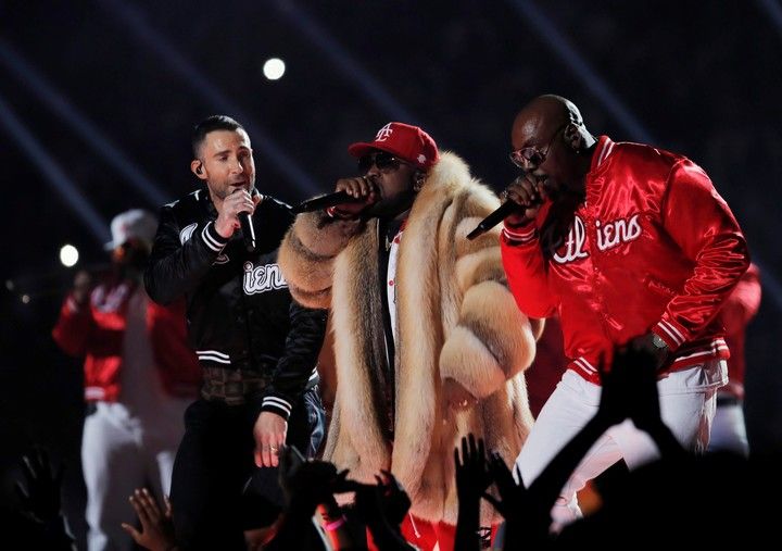 Los tres veces ganadores del Grammy además compartieron escenario con el rapero Travis Scott, Big Boi y la cantante de soul Gladys Knight, quien había entonado el himno estadounidense en la previa del encuentro.