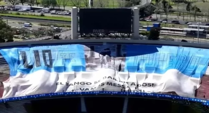 Según se pudo descubrir gracias a las imágenes aéreas tomadas por un drone de ESPN, en la tribuna Sívori alta del estadio de River Plate se desplegó un inmenso telón en homenaje al goleador histórico de la Selección, con una frase y una foto que lo une al otro gran ídolo albiceleste: Diego Armando Maradona. La bandera celeste y blanca, que tiene una medida de 100m x 50m, posee una leyenda en letras negras que dice: “Lio, te quiero. El tango se baila de a dos. Vamos Messi”. En el centro de la misma se puede ver la estampa de una foto en la que se ve a Maradona y Messi abrazados, de espaldas, como si estuvieran ingresando al Olimpo de los dioses.