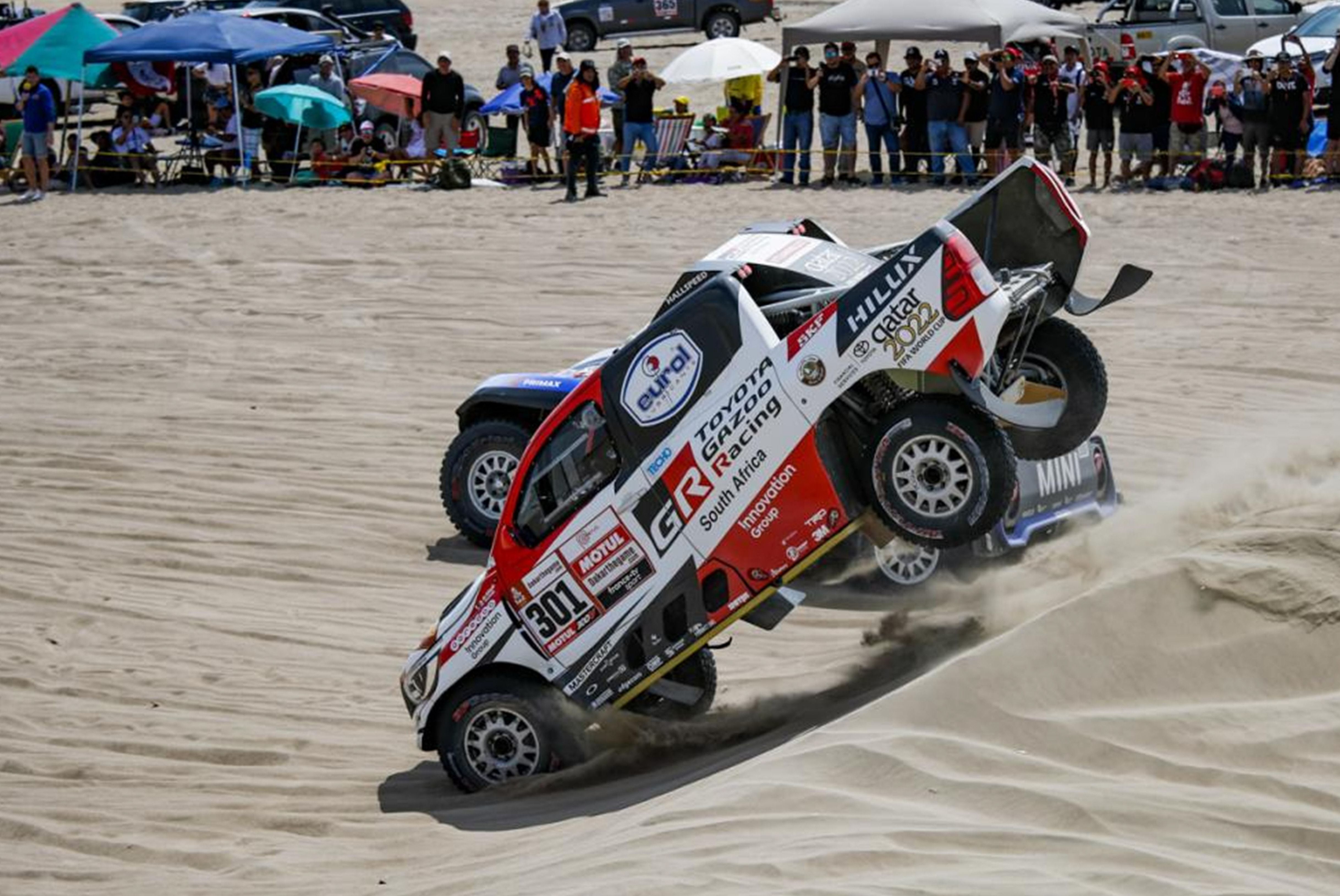 Sobrepaso. Nasser Al-Attiyah, a bordo de su Toyota, supera en un salto al Mini de Carlos Sainz. El qatarí tuvo un amplio dominio en la primera etapa.