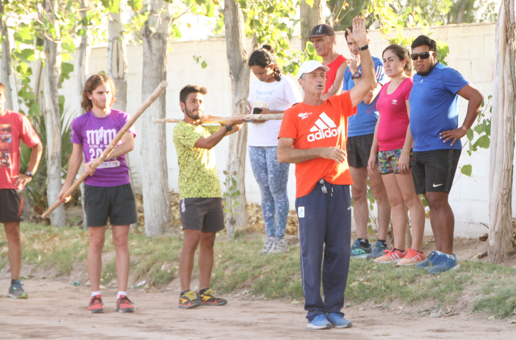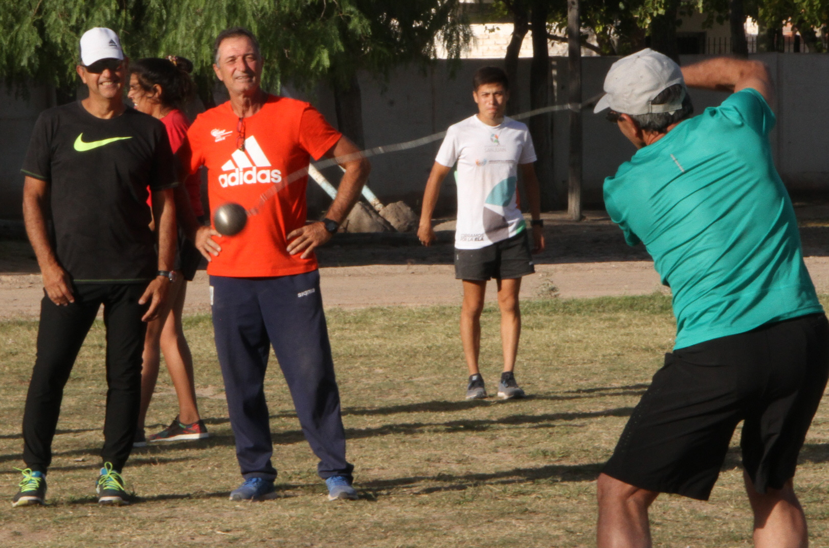 Junto al profesor Carlos Cavallero, Guillermo Chiaraviglio observa cómo los asistentes al curso practican la técnica del lanzamiento del martillo.