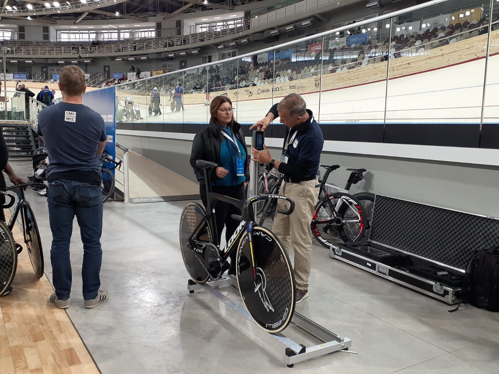 Antes de que los competidores suban a la pista a rodar, las bicicletas pasan por dos sectores que son clave.