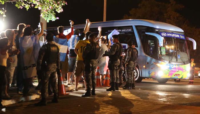 El micro que transportó a la delegación desde el aeropuerto internacional Presidente Juscelino Kubitschek hasta el hotel donde se hospedará en Brasilia, ingresó por delante de una caravana de automóviles de custodia dispuestos por la organización del Mundial.