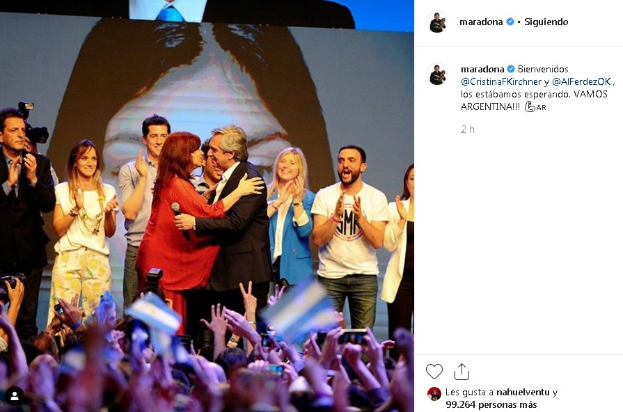 Diego Armando Maradona celebró en la mañana del lunes la victoria del Frente de Todos en las elecciones presidenciales. "Bienvenidos, los estábamos esperando. ¡VAMOS ARGENTINA!", escribió el astro argentino en su cuenta de Instagram junto a una foto de Alberto Fernández, próximo presidente electo, hincha de Argentinos Juniors, cuyo estadio se llama Diego Armando Maradona, y Cristina Fernández de Kirchner, futura vicepresidente e hincha de Gimnasia y Esgrima de La Plata, club que dirige el Diego.