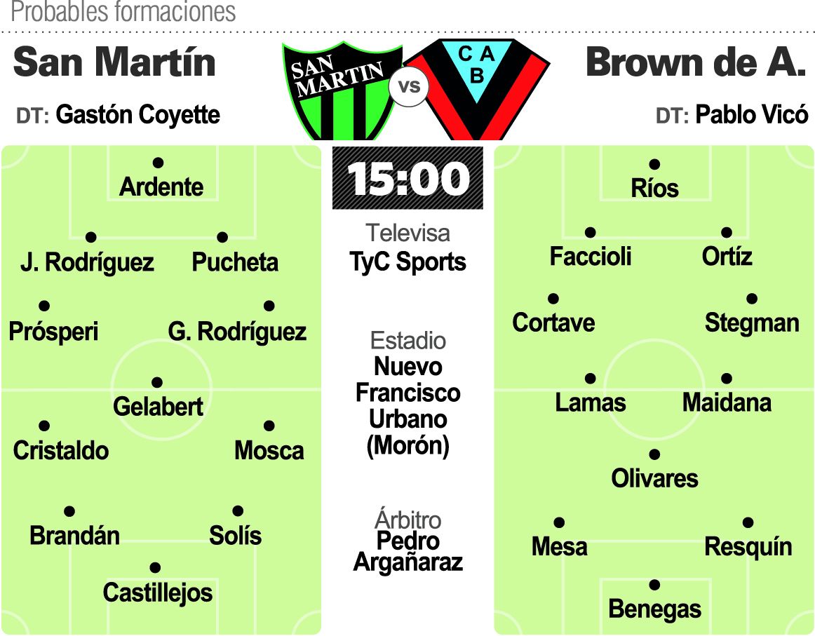 Será el tercer partido entre San Martín y Brown de Adrogué en el historial, que tiene dos triunfos del verdinegro, que se registraron en la temporada 2013-2014 de la B Nacional.