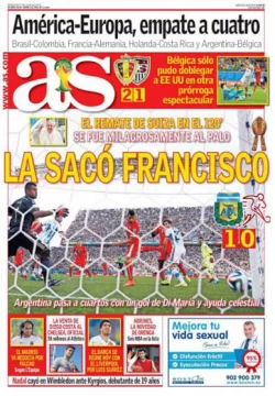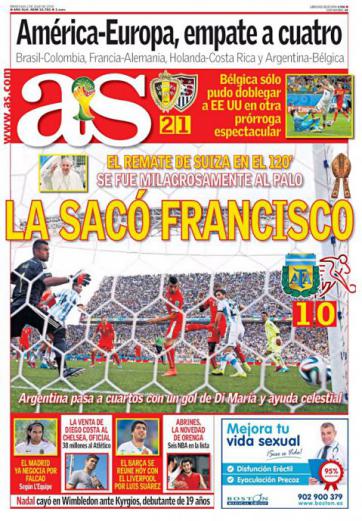 As: "La sacó Francisco". Argentina pasa a cuartos con un gol de Di María y ayuda celestial. El remate de Suiza en el 120′ se fue milagrosamente al palo.
