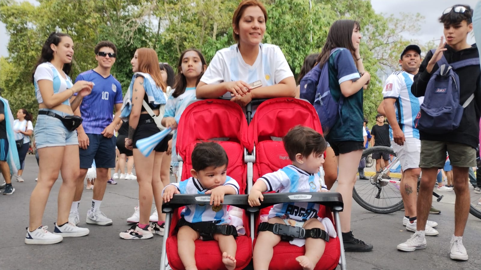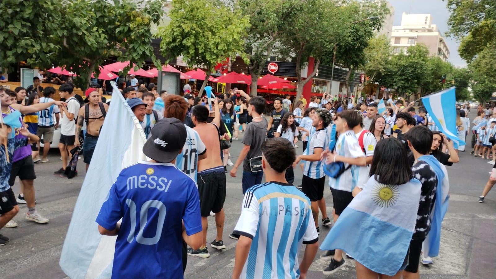 Los fánaticos, a pura bandera y camiseta revoleando por encima de los hombros, entonó el hit de este Mundial: "Muchachos, ahora nos volvimos a ilusionar… quiero ganar la tercera, quiero ser campeón mundial y al Diego, en el cielo lo podemos ver con don Diego y con la Tota, alentándolo a Lionel".
