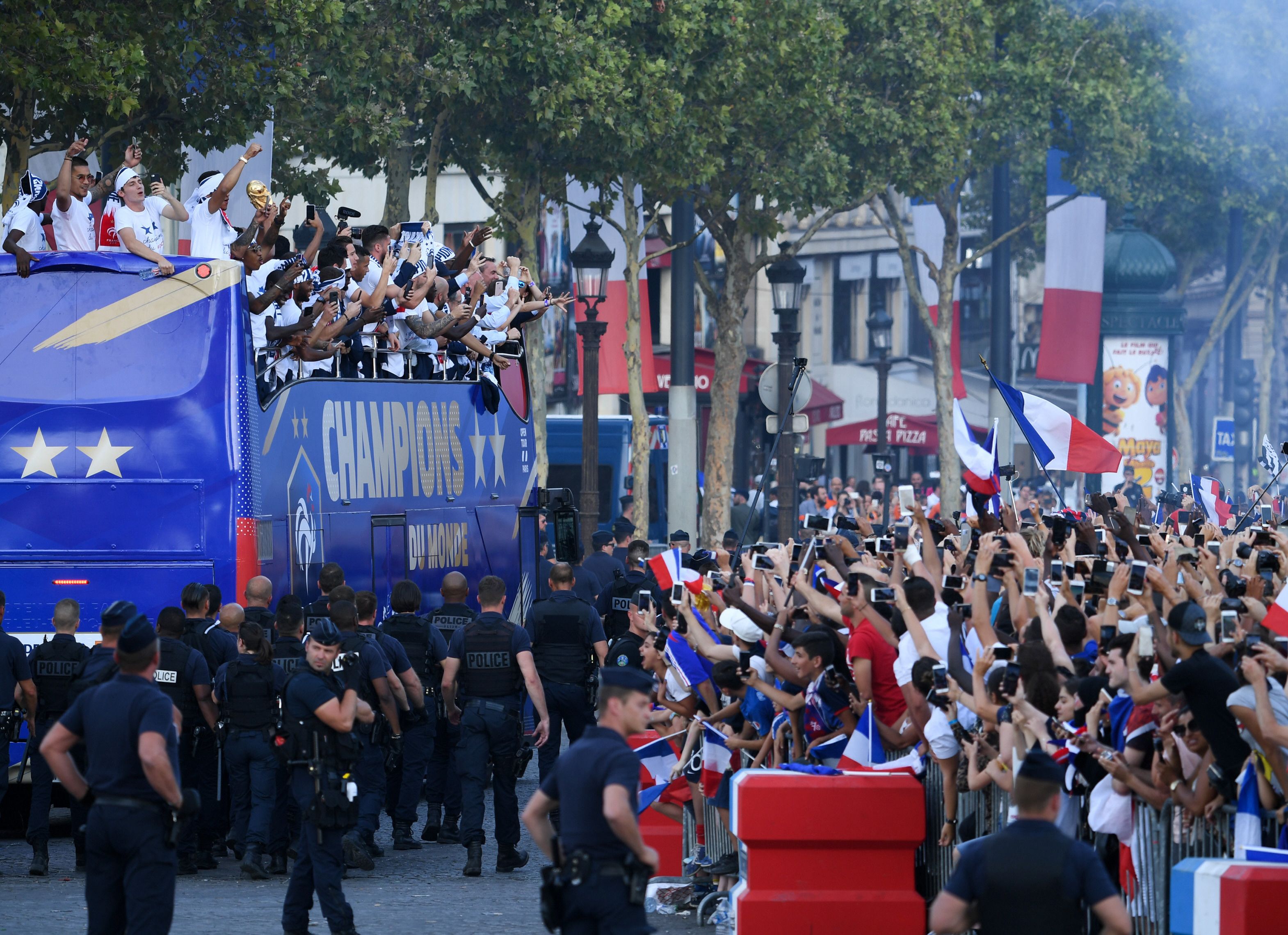 Signo de los tiempos que corren, en los que la seguridad ha cobrado un espacio cada día más importante, sobre todo en un país machacado por el terrorismo, el paseo en autobús descapotable lo hicieron los "bleus" de ayer alejados de los hinchas, separados por un impresionante despliegue policial.