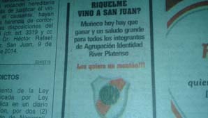 San Juan, 25 de septiembre.- Los hinchas de River no estuvieron ajenos al paso de Juan Román Riquelme por San Juan y, alimentados por la derrota del equipo del ex Boca y la pálida actuación del enganche, salieron a la luz las cargadas. Hoy, en la edición impresa de DIARIO DE CUYO, la Agrupación Identidad Riverplatense hizo gala de su ironía y publicó un aviso donde se pregunta ¿Riquelme vino a San Juan?.