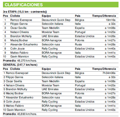 Tras lo acontecido en las dos primeras etapas donde representantes de los equipos continentales sanjuaninos hicieron podio (NdeR: Contte, tercero y Naranjo segundo, en distintos días) quedaba la incógnita de la contrarreloj. No haber podido ingresar al top-10 con ningún ciclista es una clara muestra de las notorias diferencias que existen entre el primer mundo del pedal mundial y su tercer estamento. Con gran dignidad Leonardo Cobarrubia y Juan Pablo Dotti, que tuvieron un desempeño óptimo para el nivel nacional, no tuvieron opción alguna contra esa maravilla que es Evenepoel y consiguieron, luego de una metódica preparación, superar a corredores como el chubutense Eduardo Sevilla quien es una pieza importante dentro del equipo World Tour español, Movistar Team.