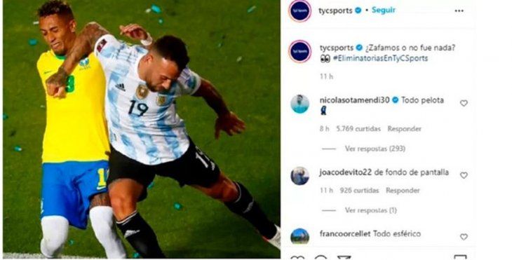 Sin embargo, en las últimas horas, Otamendi apareció en las redes sociales y dejó un pícaro comentario en una publicación que hizo la cuenta de TyC Sports. “Todo pelota”, escribió el jugador del Benfica, en una clara ironía sobre la jugada.