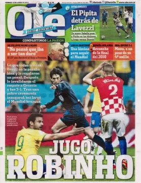 Buenos Aires, 13 de junio.- El triunfo polémico que logró Brasil ante Croacia en la inauguración del Mundial, fue el eje central de la tapa de los diarios. La actuación del árbitro japonés Yuichi Nishimura estuvo en el centro de las críticas ya que sus fallos beneficiaron al equipo de Luis Felipe Scolari.