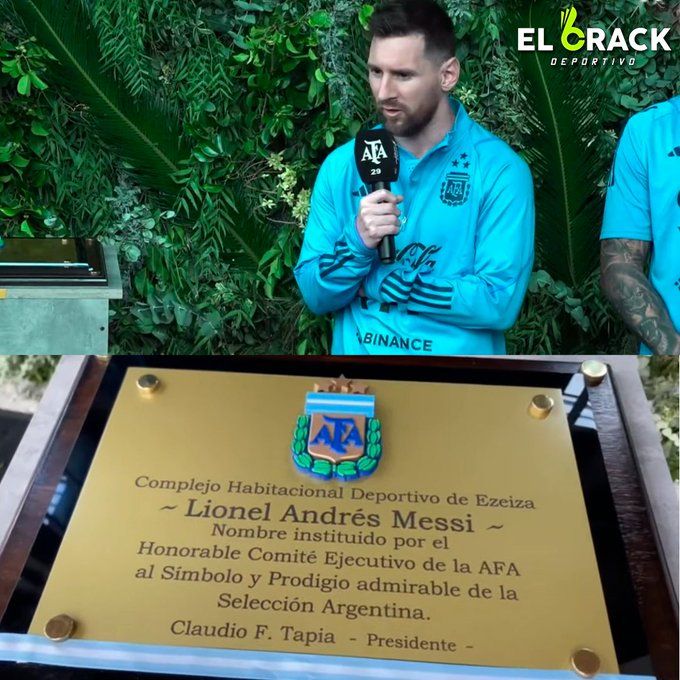 Y agregó: “El complejo habitacional y deportivo de Ezeiza a partir de hoy va a llevar un nuevo nombre. Lionel Messi es nuestro capitán y nuestro emblema, que siempre ante las adversidades prefirió buscar la revancha, y buscar el éxito”, explicó Tapia.