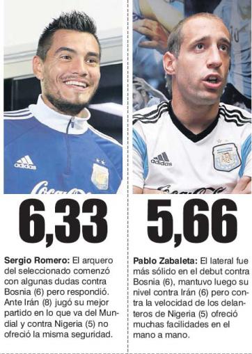 Pasó la fase clasificatoria y Argentina cumplió con los pronósticos: clasificó sin problemas, con puntaje ideal y siendo líder de su grupo. En los números, impecable. Ahora, en los rendimientos, la producción del conjunto de Sabella entregó muchas aristas a partir de las actuaciones individuales y colectivas en los tres partidos que ya jugó en Brasil. En cifras -esas que no mienten- Argentina redondeó un promedio general de 5,72 entres los 17 futbolistas que utilizó en esta etapa de clasificación. El punto más alto lo tuvo en Lionel Messi, figura consular, indiscutida e irreemplazable de Argentina. Lio empezó de menor a mayor y contra Nigeria hizo mucho de lo que se le espera. En contraste, habiendo jugado la misma cantidad de partidos, el que menor rendimiento mostró fue el zaguero Federico Fernández, quien nunca pudo consolidar su juego en beneficio de un equipo que ataca mucho por naturaleza y que tiene necesidad de estar bien parado atrás.