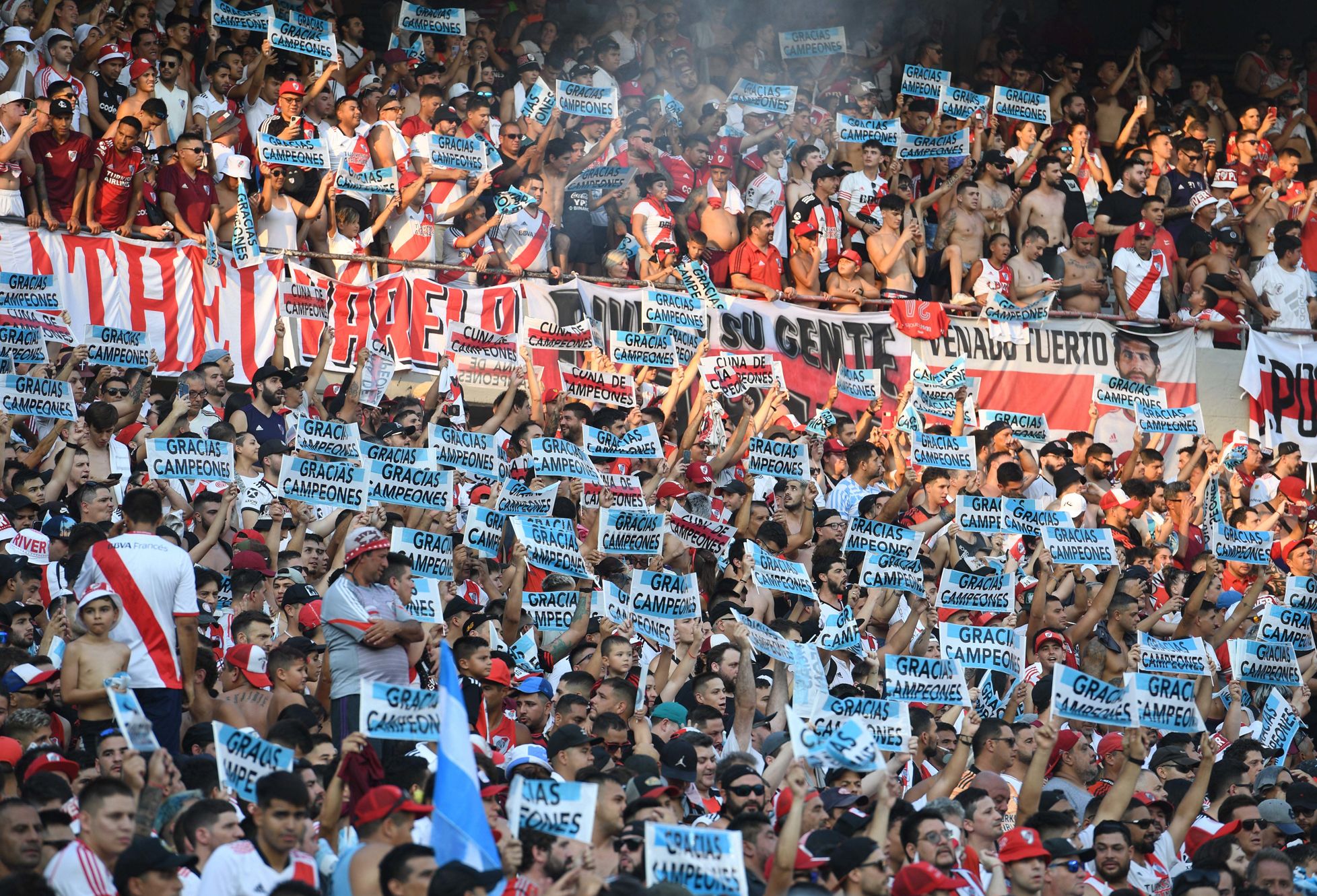 "¡Dale campeón, dale campeón!", cantaron los fanáticos de River, en conmemoración por la obtención del título en Qatar 2022, con Armani como integrante del plantel dirigido por Lionel Scaloni y varios exRiver, desde Julián Alvarez a Enzo Fernández, quienes enviaron mensajes y fueron homenajeados en videos que se vieron en pantalla gigante, ante el delirio de los simpatizantes del Millo, que dio grandes figuras al seleccionado campeón.