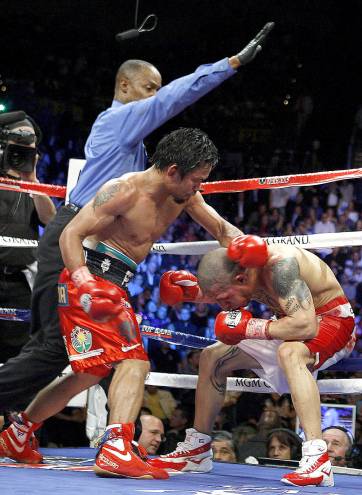 El árbitro Kenny Bayless se vio obligado a detener la pelea en el décimo segundo episodio, después de que Cotto, de 29 años, ya no peleaba sino que trataba sólo de escapar del castigo que le propinaba Pacquiao.