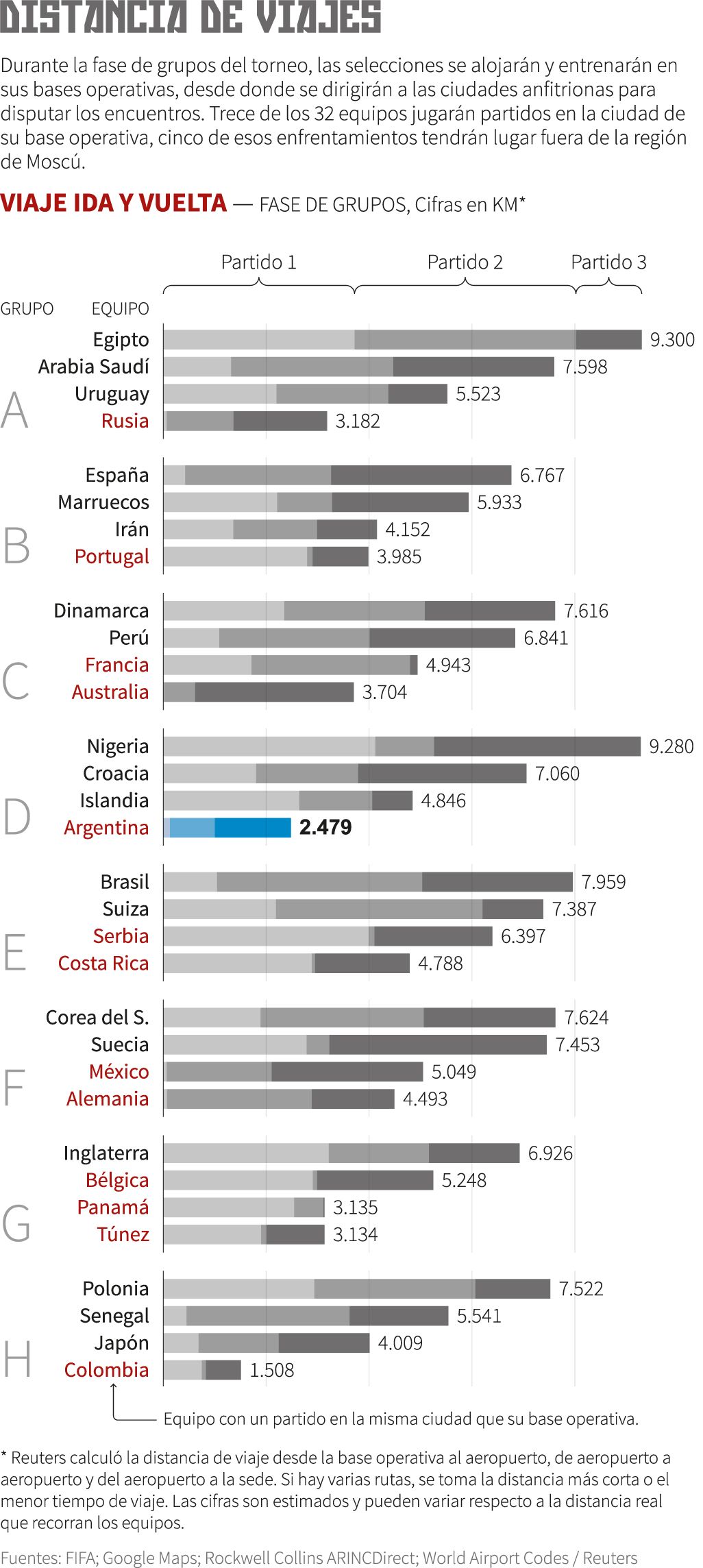 También Argentina está entre las mejores ubicadas, ya que desde su concentración en Moscú disputará su primer partido en esa misma ciudad, en el estadio del Spartak, y luego se trasladará a Nizhny Novgorod y a San Petersburgo, para completar un total de 2.479 kilómetros.